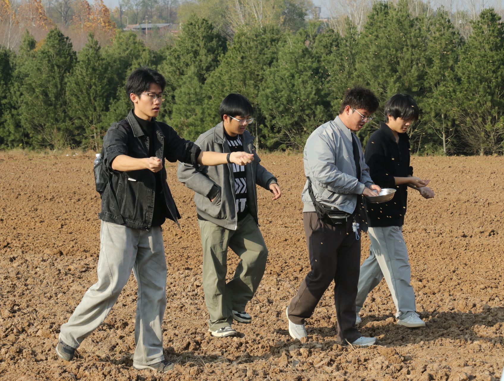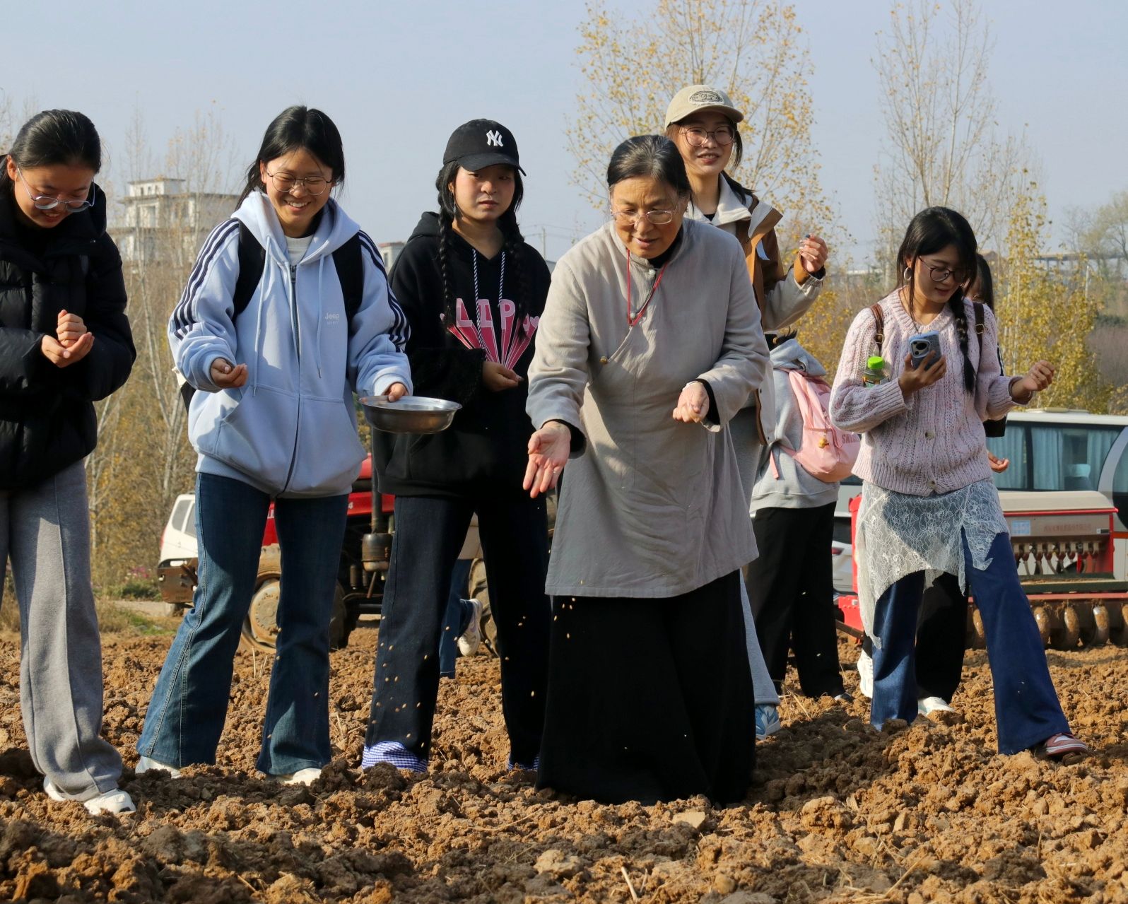 田间地头,大一同学们在当地农技员指导下,认真学习小麦播种、施肥、灌溉等农耕技能。大家分工协作,有的挥锹铲土整畦,有的弯腰播撒麦种,有的跟着学习操作农机。亲身劳作中,大家真切体会农业劳动的艰辛与价值,明白“一粥一饭来之不易”。协作交流间,陌生的彼此渐渐熟络,集体凝聚力在汗水中悄然增强。一畦畦整齐田垄向远方延伸,秋日大地重归平整,金色麦种深埋沃土,静待来年萌发。