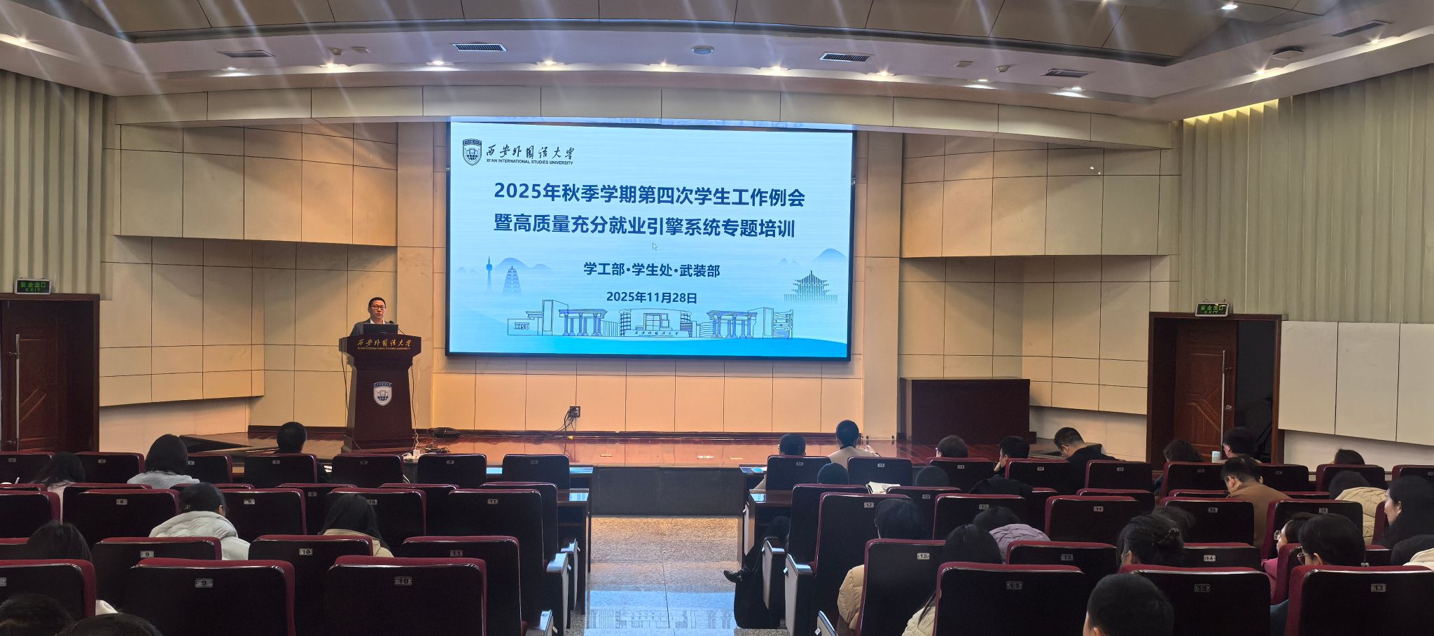 11月28日上午,学工部在校务楼一层报告厅召开2025年秋季学期第四次学生工作例会暨高质量充分就业引擎系统专题培训。学工部处科级干部、各学院党委副书记及全体专兼职辅导员参会,会议由学工部副部长杨小江主持。