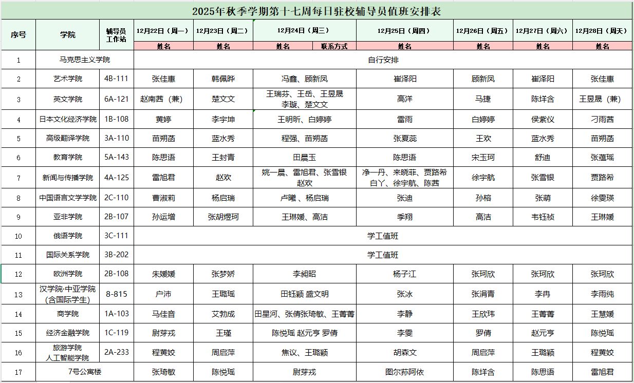 为维护校园安全稳定,落实“六位一体”思政进公寓工作,推动学校“一站式社区”建设,提升学生教育管理的质量,自2023年春季学期起,学工部将每周公布学工系统值班安排表,各位同学如需咨询事项、寻求帮助、提出建议、反映问题等可联系当日值班老师。