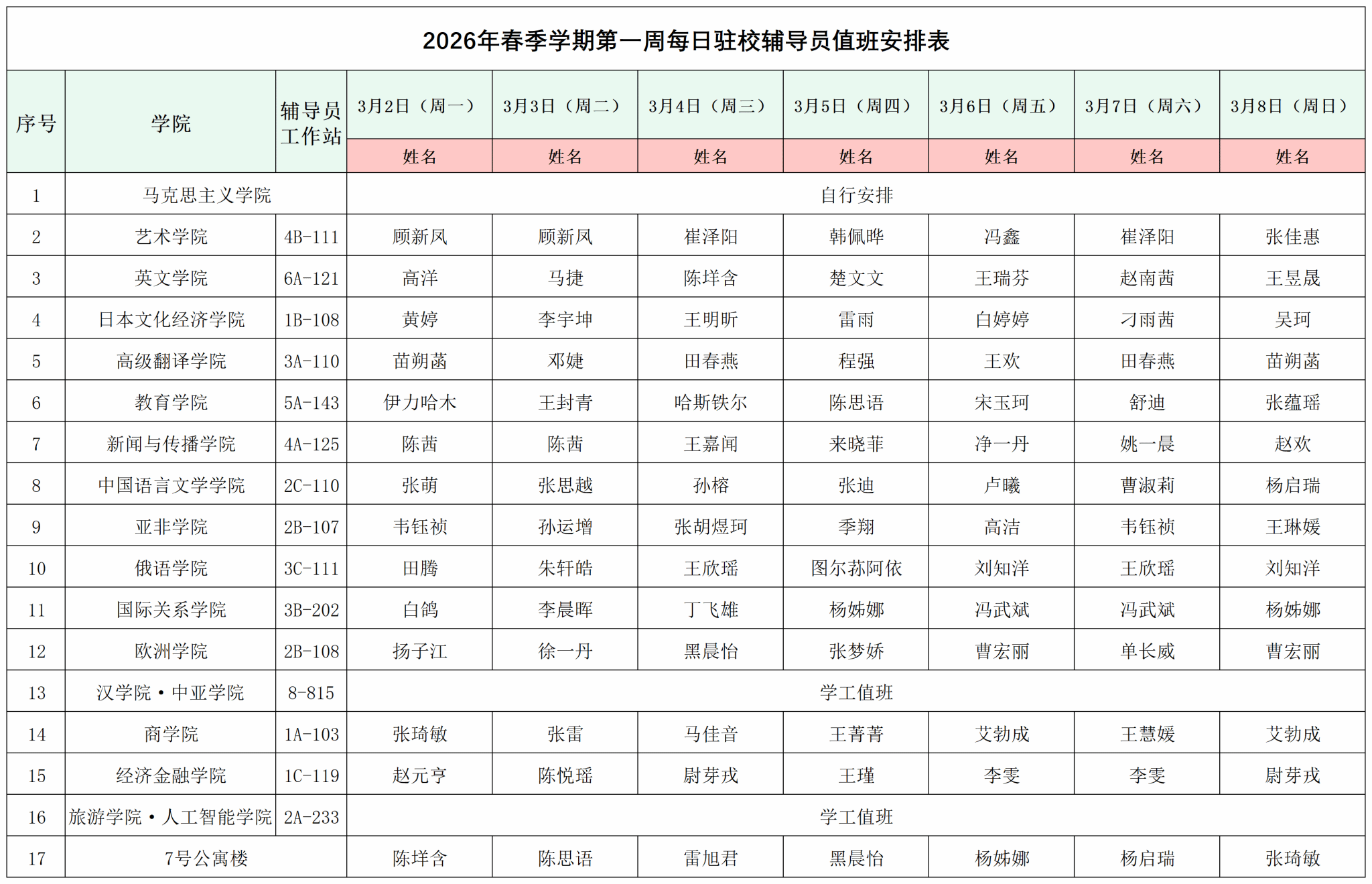 2026年春季学期第一周学工值班表