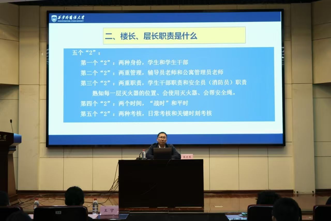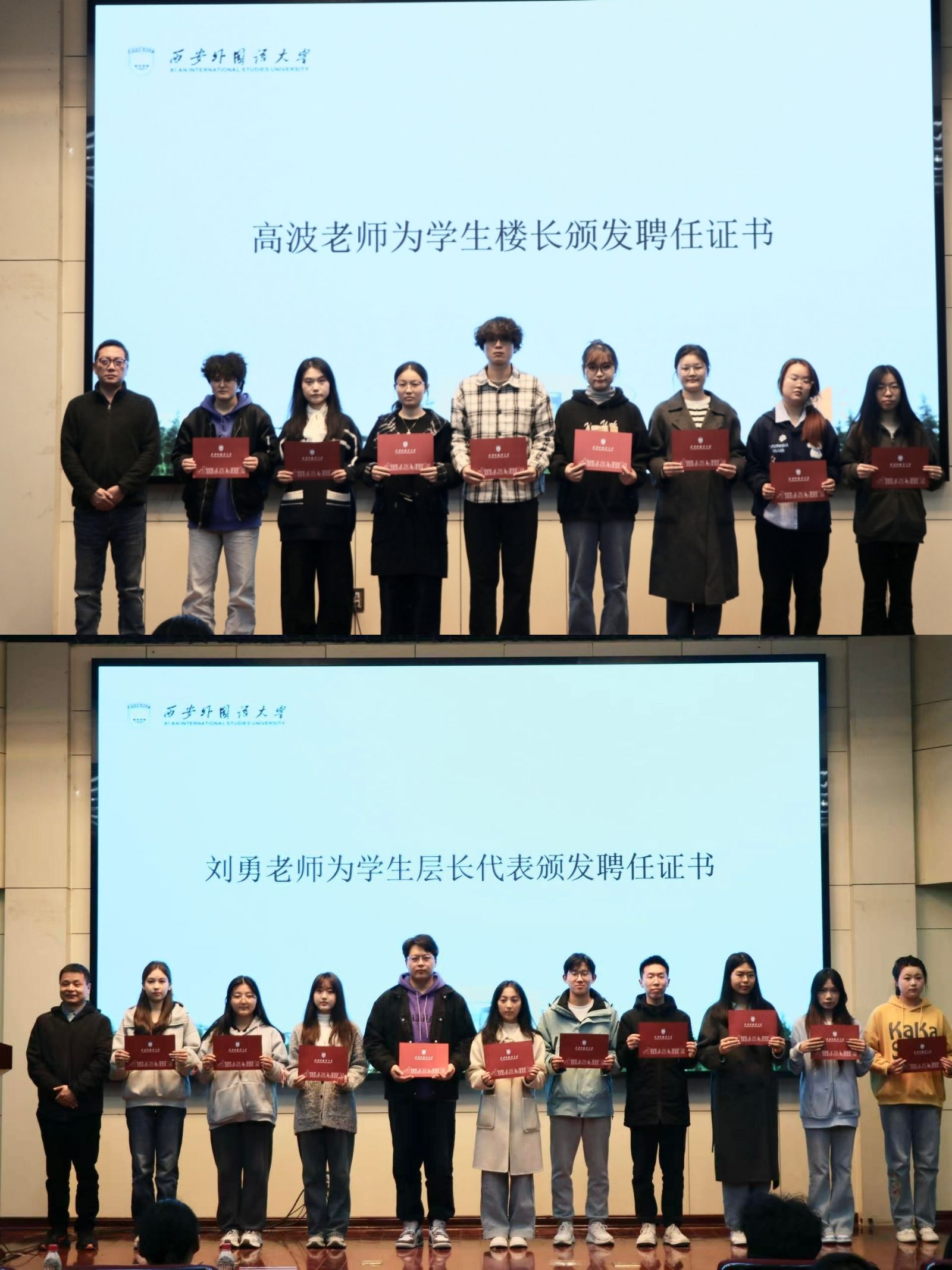 会议伊始,杨小江宣读《关于聘任贾晨曦等143名同学为西安外国语大学学生公寓楼长、层长的决定》。随后,学生公寓中心负责人高波为学生楼长颁发聘任证书,校宿管会指导老师刘勇为学生层长代表颁发聘书,全体受聘同学接过聘书,正式肩负起宿舍管理与服务的责任。