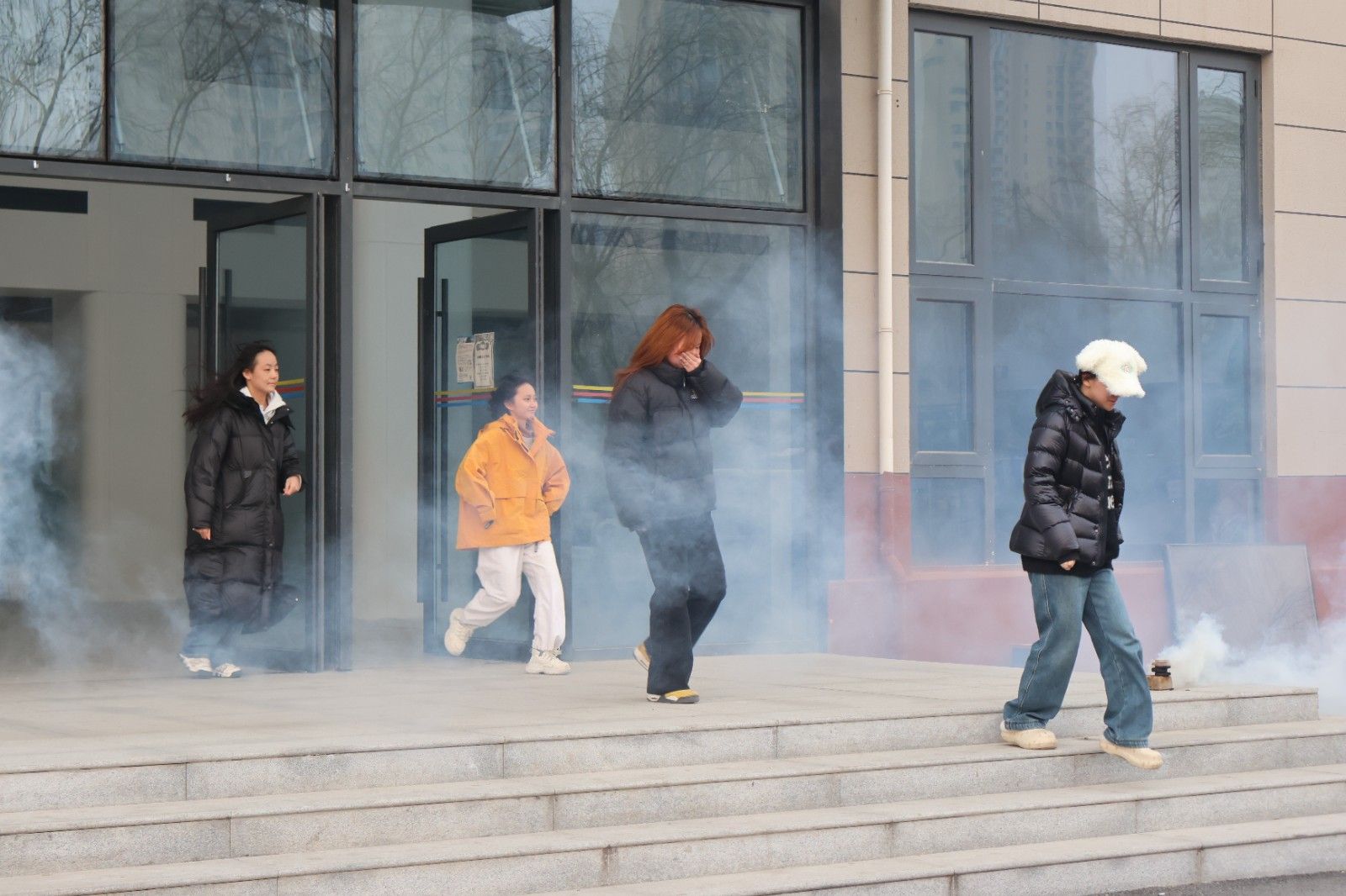 本次演练模拟8号公寓某宿舍突发火情。消防警报响起后,楼内学生在疏散引导员的指挥下,迅速沿紧急疏散通道有序撤离,并在指定安全区域集结。演练专门设置火灾烟雾模拟环节,真实还原火场浓烟环境,使师生在实践中熟悉应急疏散流程,掌握避险逃生要领。